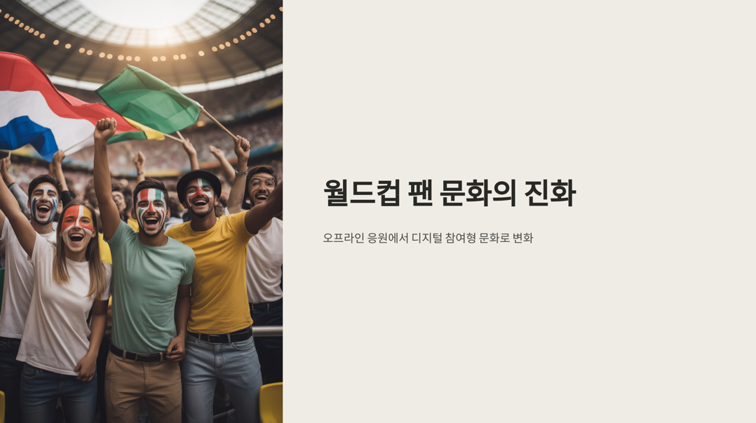 FIFA 월드컵은 전 세계인이 함께 즐기는 스포츠 이벤트 중에서도 가장 글로벌한 축제로 꼽힙니다. 그동안 월드컵의 팬 문화는 시대와 기술의 발전에 따라 빠르게 변화해왔습니다. 과거 오프라인 중심의 집단 응원에서 디지털과 SNS 중심의 참여형 응원으로, 그리고 팬이 직접 콘텐츠를 만들고 공유하는 밈(Beme) 문화로까지 확장된 현대의 팬 문화는 월드컵의 흥행뿐 아니라 사회적 파급력에도 큰 영향을 미치고 있습니다. 본 글에서는 월드컵 팬 문화의 역사와 진화 과정을 살펴보고, 디지털 시대에 맞춰 새롭게 변화하고 있는 팬덤의 양상과 향후 전망까지 함께 분석합니다.